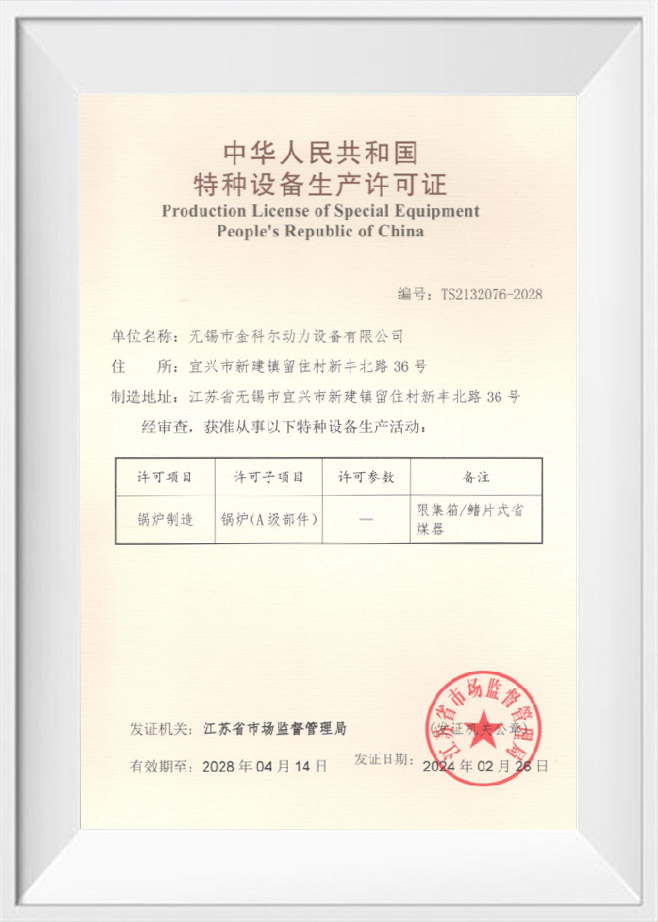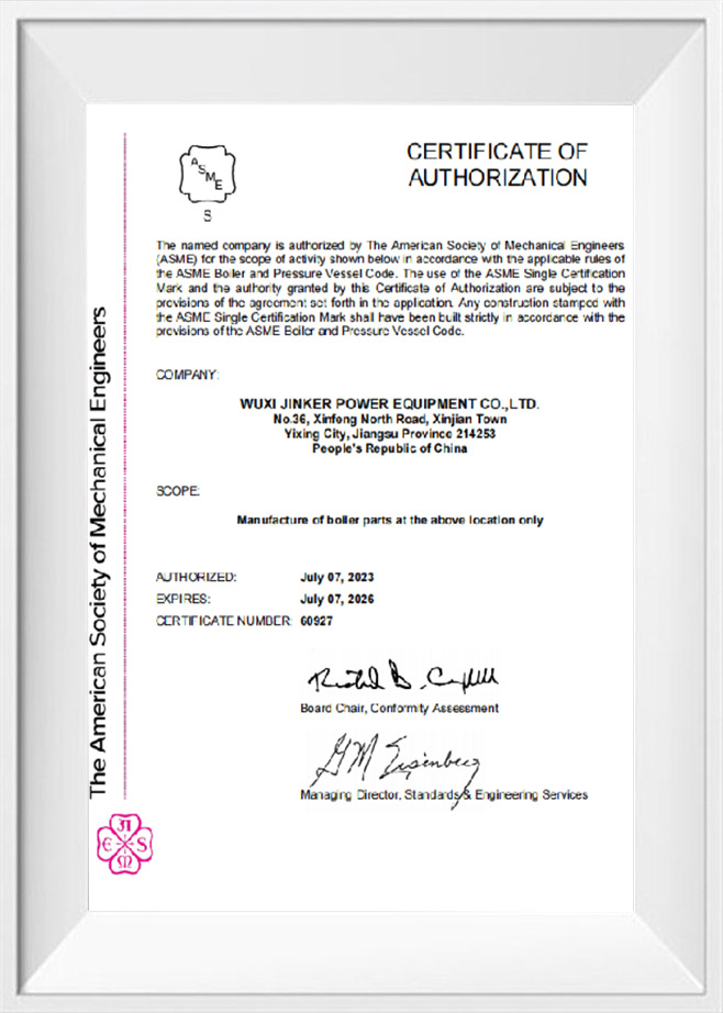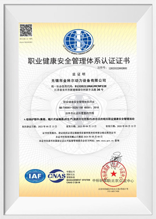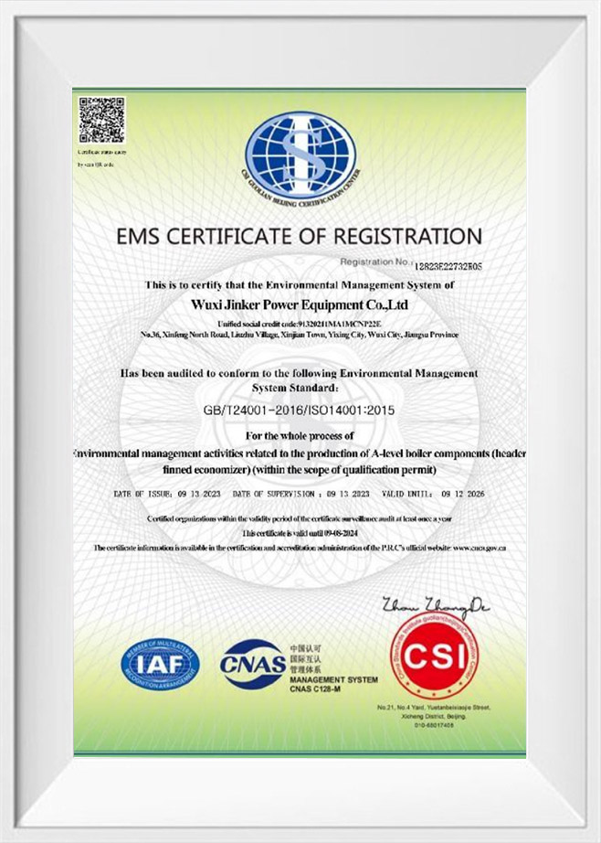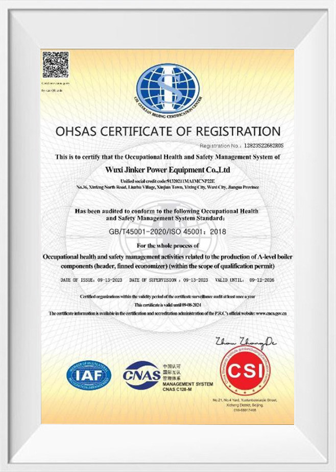 Biz, A seviyesi kazan parçaları (başlık, yakıt ekonomizeri) için üretim lisansına sahip bir kuruluşuz ve ASME-S yeterliliğine sahip bir kuruluşuz, ISO9001、ISO14001、ISO45001、ISO 3834-2.